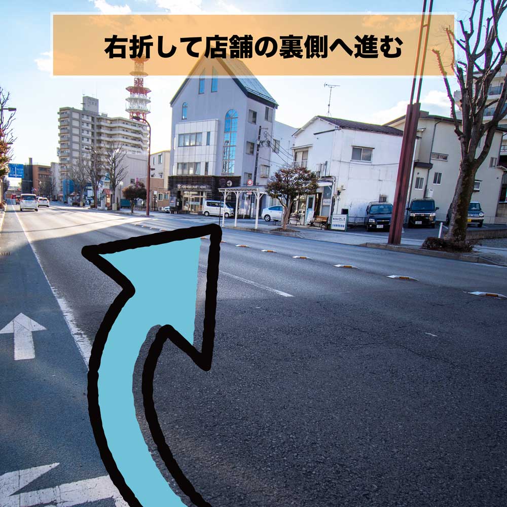 いちょう通り、旭中学校方面からお越しの場合は左手に店舗が見えましたら、店舗手前の道へ左折してください。